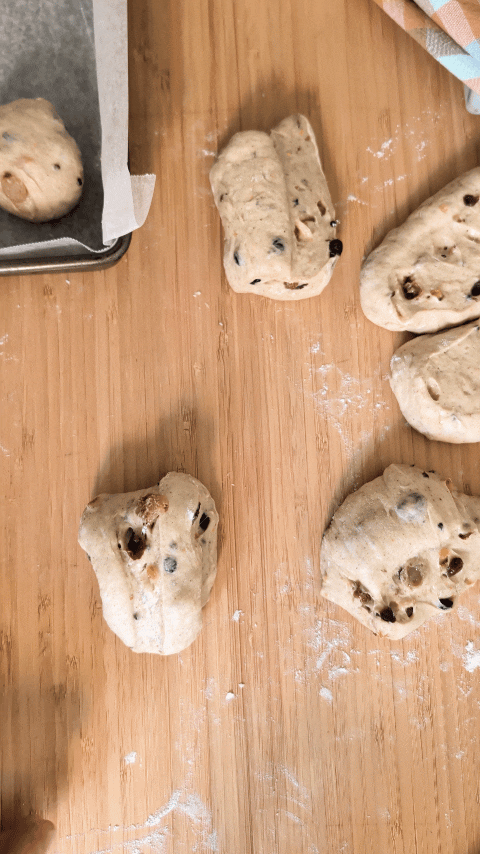 Next, make the cross mixture by whisking all the ingredients in a small bowl until smooth. Pour into a piping bag, snip a 3-5mm opening in the bag and pipe your preferred cross design on the buns. Bake for 20-30 minutes or until golden brown. If you have a digital thermometer you can test the doneness of the buns by inserting the thermometer into the sides of a bun. The buns are done when they reach about 90 degrees C.