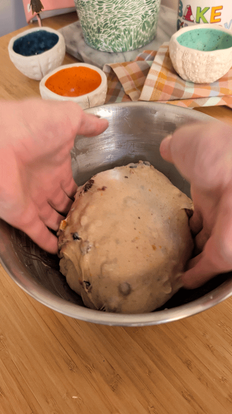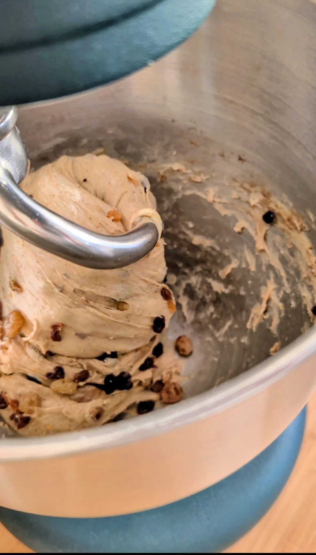 Drain any excess liquid from the soaking fruit and then add the mixed peel and spices and mix to combine. Add the spice-covered fruit into the stand mixer bowl and mix on low (speed 1 on my KitchenAid) until the fruit is evenly incorporated into the dough.