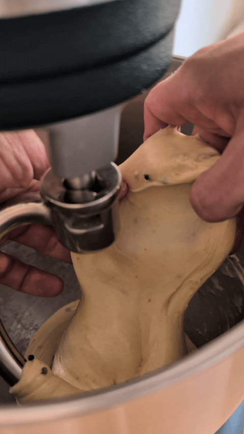 To make the dough, add the flour followed by all the dough ingredients (other than the extra egg for the egg wash) into the stand mixer bowl. Attach the dough hook and mix on a low/medium (speed 3 or 4 on my KitchenAid) for 10-15 minutes, or until the dough comes together as a single, stretchy dough. Use the windowpane test to see if the dough is ready.